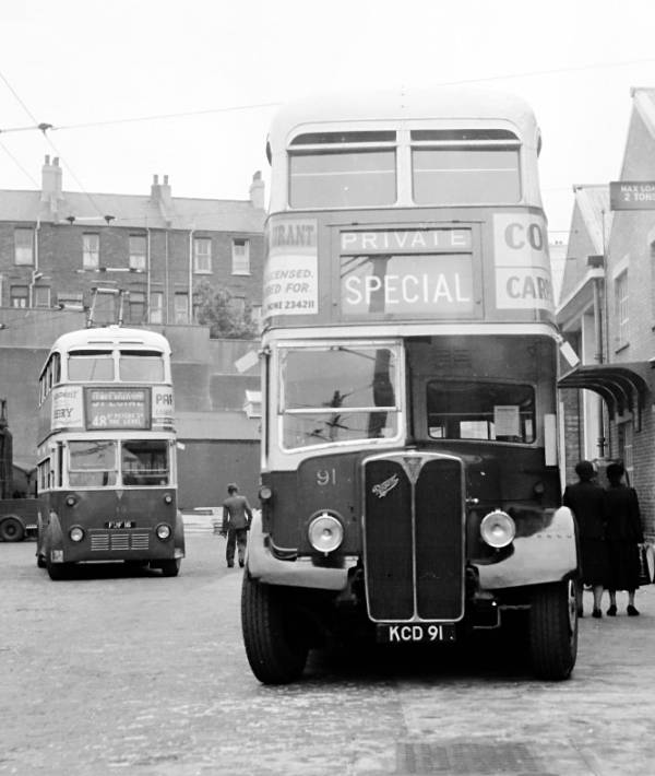 Brighton Corporation 91, KCD91, an AEC Regent III with Weymann body new in 1949, with Trolleybus 16, FUF16, a 1938 AEC 661T, also with a Weymann body, in the background