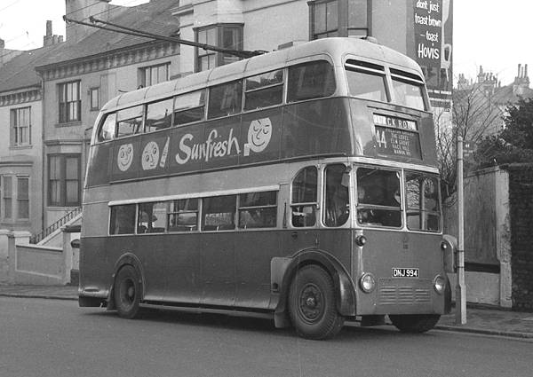 Brighton, Hove & District 393, DNJ994, was one of three B.U.T. 9611Ts with Weymann H30/26R bodies new in 1948.