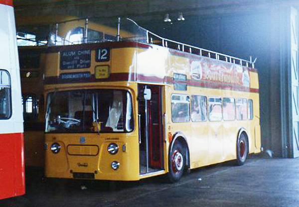 Bournemouth Corporation Daimler Fleetline open topper 180, CRU180C, new in 1965. Photo taken by Wilf Greaves, c.1992, Mallard Road Depot, Bournemouth See the Site Map for further details about copyright.