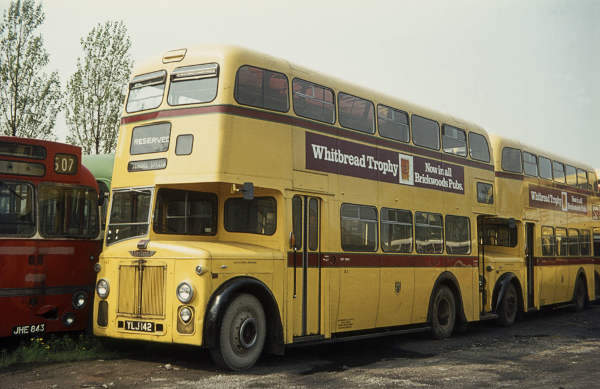 Former Bournemouth Corporation 142, YLJ142, a Leyland Titan PD3/1 with Weymann Orion H37/25D body, new in 1959. Seen, along with others of the same batch, at the premises of W. North, the dealer, of Sherburn-in-Elmet in 1973.