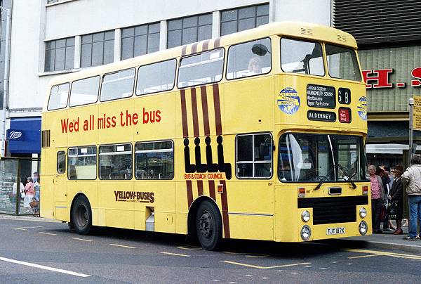 Bournemouth Marshall bodied Olympian 187, TJT187X, at Bournemouth Square on 2nd June 1986. It is not amphibious, so the Alderney it is heading for is unlikely to be the one in the Channel Islands!