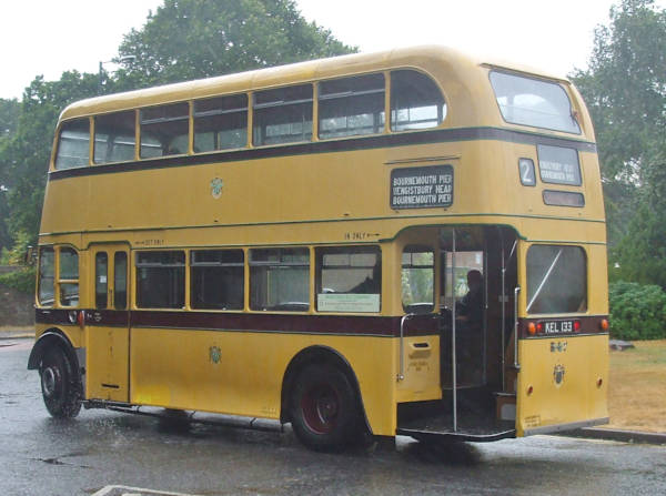 A rear view of a traditional former Bournemouth Corporation Transport bus, employed on a summer Sundays service linking Bournemouth town centre with Hengistbury Head. KEL133 is a Leyland PD2/3 with Weymann bodywork new in June 1950 featuring the unusual two door/two staircase layout favoured by BCT.
