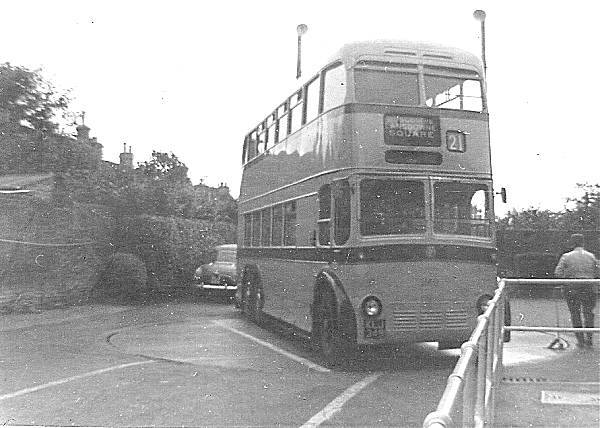 One of Bournemouth's six wheelers, 249, KLJ349 on the turntable at Christchurch, a BUT with Weymann body new in 1950.