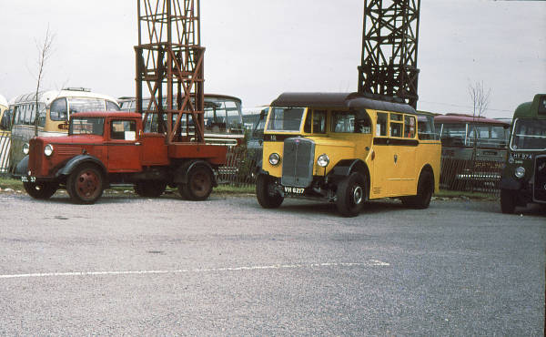 Unfortunately I had knocked my camera and dislodged the viewfinder which I didn't discover until I eventually got the slides back, hence my cutting off the tops of the towers. On the left is DEL37 a 1937 Bedford WHG tower wagon of Bournemouth Corporation Transport which had entered preservation, but may not have survived. On the right is VH6217 an ex Huddersfield AEC Regent acquired by Bournemouth in 1945 but not used in passenger service, instead being rebuilt as a tower wagon. Originally also painted crimson it was later painted in the standard primrose and maroon livery, as applied to the bus fleet.