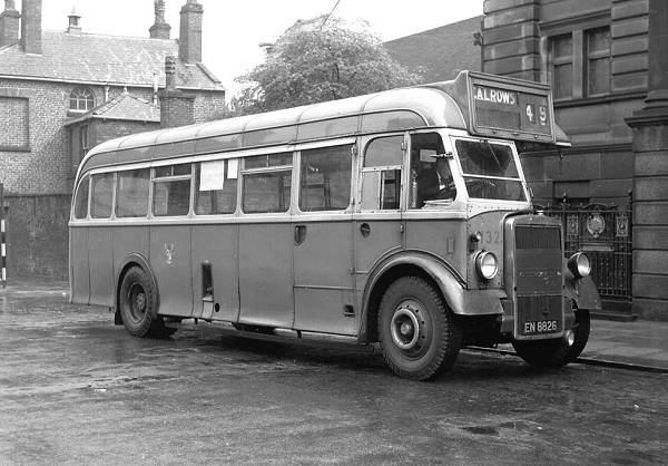 Roe B35R bodywork was fitted to this Leyland PS1 of Bury Corporation. New in 1947, 132, EN8826, one of four, is seen on a wet day in Bury.