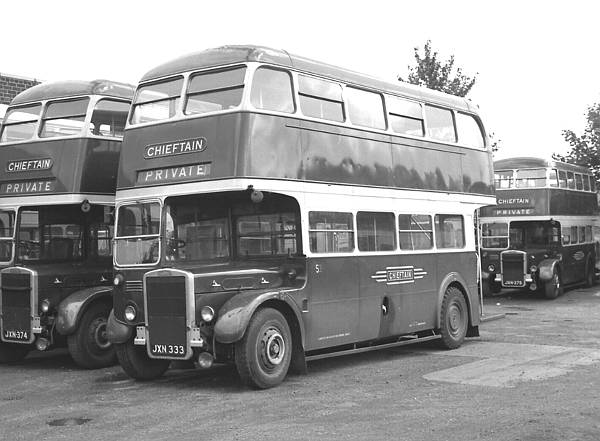 JXN333 was number 53 in the 'Chieftain' fleet of Laurie, Hamilton. It was a Leyland 7RT with a Park Royal H30/26R body which had been new to London Transport Executive in 1949 as RTL13. It later passed, in October 1961, to Central S.M.T. as HL191.