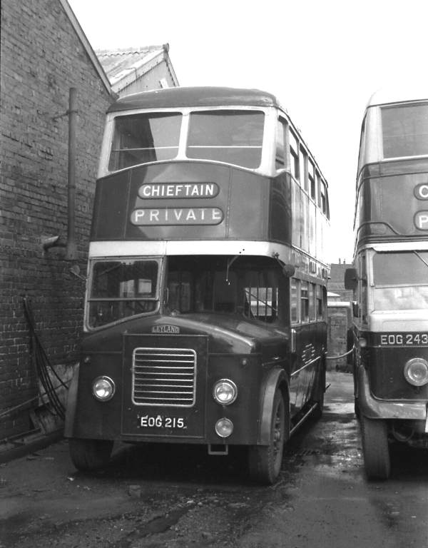 Seen at the garage in Hamilton was Laurie, Hamilton (t/a Chieftain) 56, EOG215, a Leyland TD6c which was new in 1938 with an M.C.C.W. H28/24R body as Birmingham 215. After severe war damage in 1940 due to enemy action 215, along with eleven others from the same batch, was rebodied with an English Electric H28/26R body intended for Manchester and re-entered service in 1942.