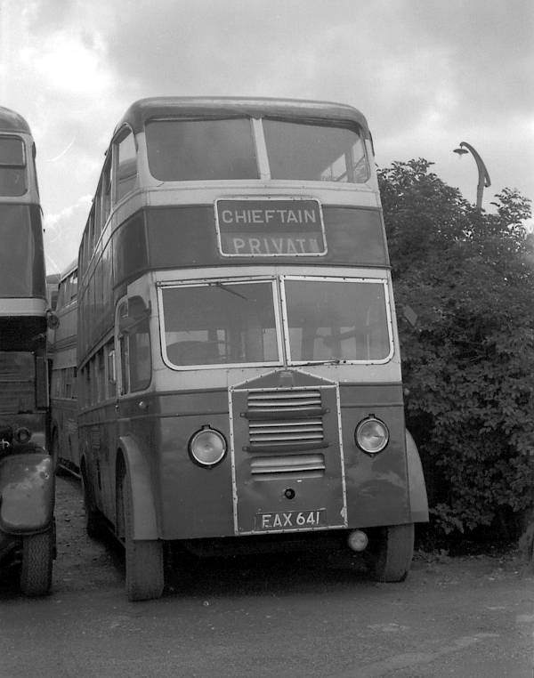 Laurie, Hamilton (t/a Chieftain) 57, EAX641, seen at the garage, was one of three Albion CX13s with Duple L30/26R bodies new in 1941 which were acquired in 1955 from Red & White, Chepstow L541 (EAX633), L241 (EAX641) and L441 (EAX642) to which Laurie gave fleet numbers 52, 54 and 53 respectively.