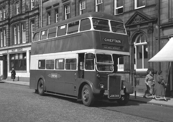 Laurie, Hamilton (t/a Chieftain) 65, JXN360, a Leyland 7RT with a Park Royal H30/26R body new in 1949 as RTL37 is seen in Brandon Street, Hamilton. This was later burnt out and was noted at Bird (dealer), Stratford-upon-Avon in August 1961.