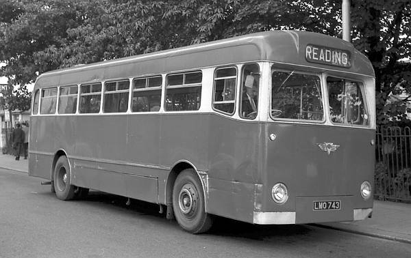 LMO743, the first of three A.E.C. MU3RV Reliances with Duple Midland B44F bodies bodies new to Chiltern Queens, Woodcote in October 1955, is seen in Reading.