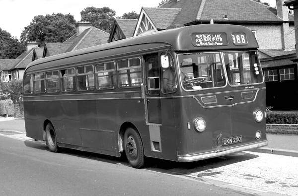 UKN200 of Cheek (t/a Elms Coaches), Kenton is seen operating the 98b service between Ruislip Station and Rayners Lane. It was a Harrington-Commer Contender with a B42F body, the first of eleven new to Maidstone and District in 1955, and had carried fleet number SO200 when new in September 1955.