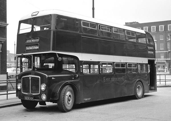 6696KH was an A.E.C. B3RA Bridgemaster with a Park Royal H45/31RD body, new in February 1960, and was East Yorkshire, Hull 696.