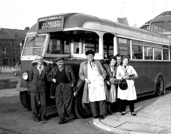 The crews of three Farsley Omnibus vehicles, led by Daimler CVD6/Roe B35F KUB695, prior to departing from the terminus at Pudsey.