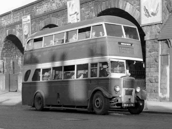 Farsley Omnibus Company DUB926, seen at Stanningley Bottoms was a Leyland TD4c with a Roe H31/25R body which had been new as Leeds 72 in December 1936.