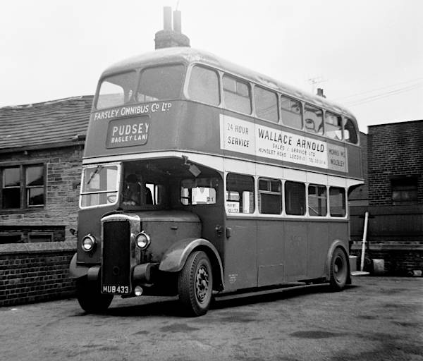 Farsley Omnibus MUB433 was a Daimler CVD6 of 1949 with a Wilks and Meade body in the Wallace Arnold coach fleet. In 1956 it was given a new Roe H33/28R body and transferred to the Farsley subsidiary.