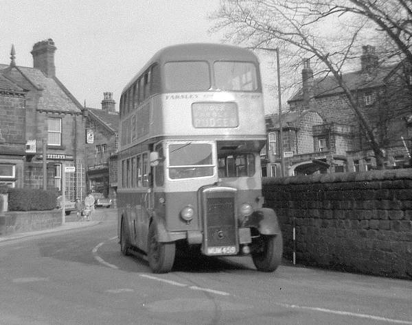 Farsley Omnibus MUM459 was a Daimler CVD6 starting life as a Wallace Arnold coach with a Wilks & Meade body in 1949.
