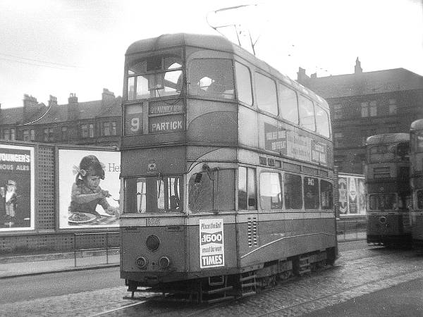 Glasgow 1166, a "Coronation" car of 1937, built by EMB/GCT, negotiates the crossover before heading back to Dalmarnock depot.