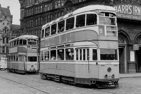 GCT Coronation tram 1282 (Preserved at Crich Tramway village) passes the former Glasgow Cross railway station underneath, heading for Auchenshuggle.