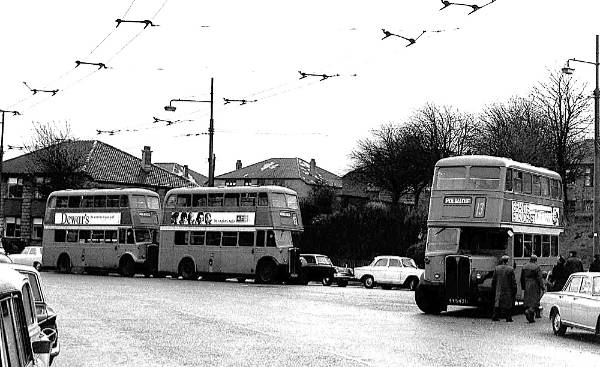 GCT A248, FYS431, an AEC Regent III with Weymann H56R body from 1951 heads a trio of similar buses on a football special service on duty at Hampden Park.