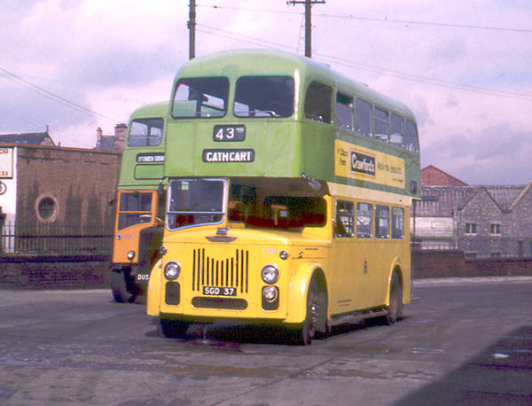 Glasgow L135 and DR29 are seen on the forecourt of Larkfield garage. L135, SGD37, was a Leyland PD2/24 with a Glasgow CT H33/28R body new in 1959, whilst DR29, DUS470, was a Daimler CWA6, new in 1946 as number 165, with a Brush H30/26R body.