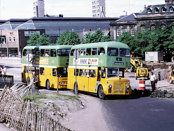 During the building of part of the inner ring road, New City Road, where the SMT sales premises can be seen, was closed off and traffic diverted onto temporary roads which connected to Cambridge Street. This resulted in buses bouncing their way towards the city as the passengers on L325, SGD327 Leyland PD2/24 with GCT body are experiencing!