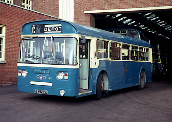 Great Yarmouth Corporation 42, GEX742F, was a Leyland PDR1/1 Atlantean with a Marshall B39F body, seen outside the garage.
