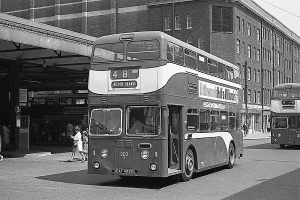 Photographed entering the old Hull Bus Station is Hull Corporation No 202, BAT402B, a Leyland Atlantean with C H Roe bodywork new in 1964. Following on behind is another Atlantean No 342, 6342KH.