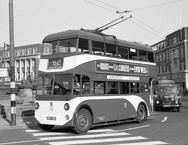 Photographed in the days when vehicles could still use Victoria Square, Hull Corporation Transport Trolley Bus No. 76, GRH296, is on route 62 turning in readiness to reload in Prospect Street.