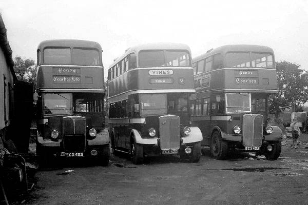 Three former Huddersfield AEC 'Regent' III/Northern Coachbuilders L29/26R of 1949 vintage re-united at the premises of Ponds of Nazeing, Essex in June 1965. ECX423 (left) and ECX422 (right) are in the Ponds fleet and retain Huddersfield's red livery while ECX420 (centre) in the Vine of Great Bromley fleet carried a maroon, grey and cream livery