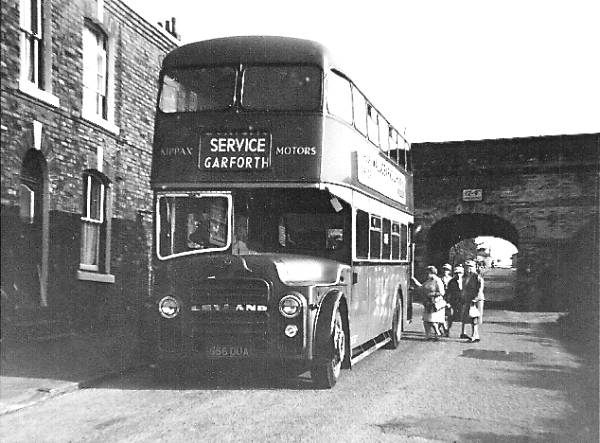 The annual Barwick-in-Elmet Maypole Day was popular enough to justify a special shuttle service from nearby Garforth, over a route not normally used by buses. This view shows the bus loading on the Barwick side of the low bridge under the Leeds-York/Selby railway, requiring passengers to walk to/from Garforth village. This bus also had to make a long detour to and from the depot in Kippax.
