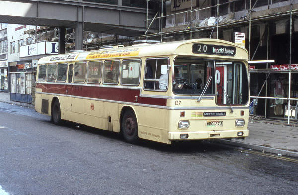 Leicester City Transport 137, WBC137J, a Metro-Scania BR111MH built in 1971 with Metro-Cammell-Weymann B44D bodywork.