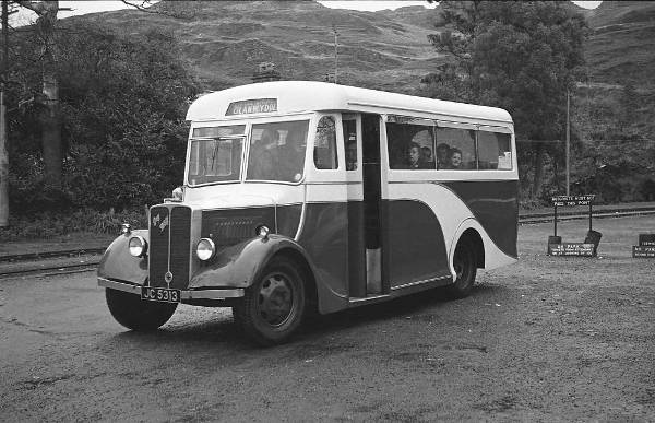Llandudno UDC Guy Wolf 20 seat coach registration JC5313 at Tan-y-Bwlch station on the Ffestiniog Railway, destination blind reads 'Glanwydden' near Llandudno.
