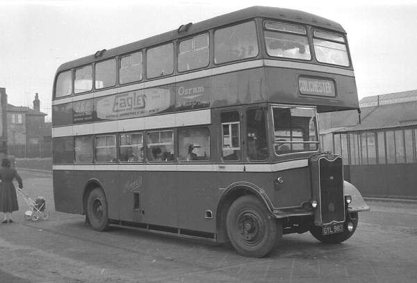 Moore Brothers, Kelvedon GYL983, seen at Braintree was a Guy Arab II with a Strachan L27/28R (8'0" wide) body fitted in 1954. When new as Birch Brothers K103 in 1945 it had a Weymann L27/28R body and passed to Moore in June 1951. In 1963 it became Eastern National 1029 on the acquisition of Moore Brothers.