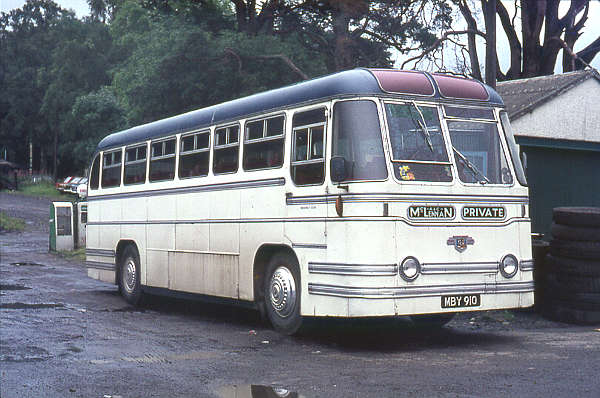 MBY910 had been new to Homeland Tours, Croydon in June 1954, one of two Leyland PSUC1/2 Tiger Cubs with Strachans Everest C41C bodies. It passed to Bourne & Balmer, Croydon when the Homeland business was aquired in April 1955 and to Timpson, London S.E.6 in April 1960 when the Bourne & Balmer business was acquired. Timpson withdrew it in October 1964 and it passed to Horlock, Northfleet in June 1965 before reaching McLennan in February 1966. It was seen at McLennan's garage at Spittalfield.