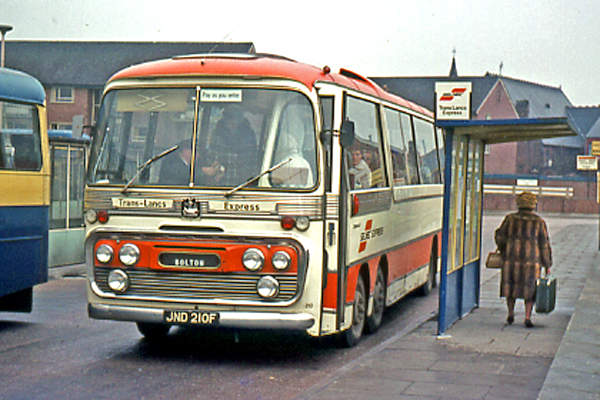 SELNEC Plaxton bodied Bedford VAL JND210F on the Trans Lancs Express service at Ashton Bus Station, probably shortly after the service started. It was new in 1968 to Manchester.