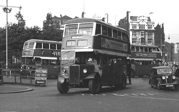 It was purchased by Manchester in July 1947 and renumbered 2960, and is seen here in Portland Street about to turn in to Parker Street Bus Station (Piccadilly). It was withdrawn in 1963 and sold for scrap after preservation attempts failed. The structure on the left is part of the framework for the 'new' bus station, long since demolished, being built at the time.