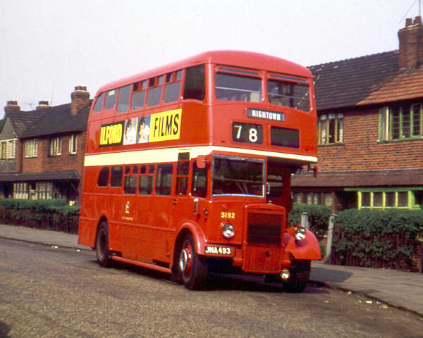 Manchester 3192, JNA493, was a Leyland PD1/3 with a Metro Cammell H32/26R body and was seen at Woodlands Street, Cheetham Hill shortly after a repaint showing the wonderful effects of the "spray everything red" painting regime.