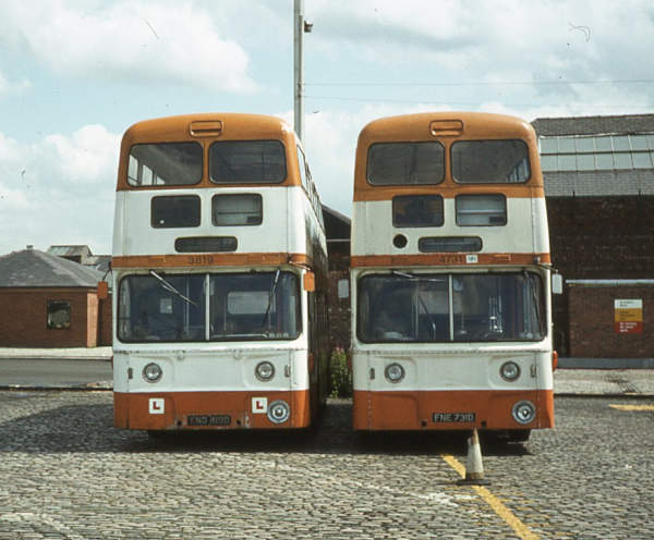 Manchester Atlantean and Fleetline comparison in the P Way yard. Leyland Atlantean PDR1/2 3819, END819D, was Stockport-based for many years, whilst Daimler Fleetline 4731, FNE731D, was clearly most recently a Northenden garage bus.