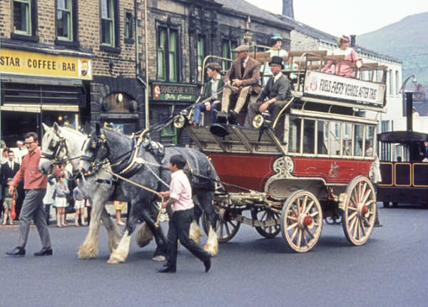 A former Manchester horse bus seen taking part in the 1968 Halifax Charity Gala procession, which was enhanced that year by a large number of PSVs brought in to celebrate of 70 years of municipal transport in Halifax.