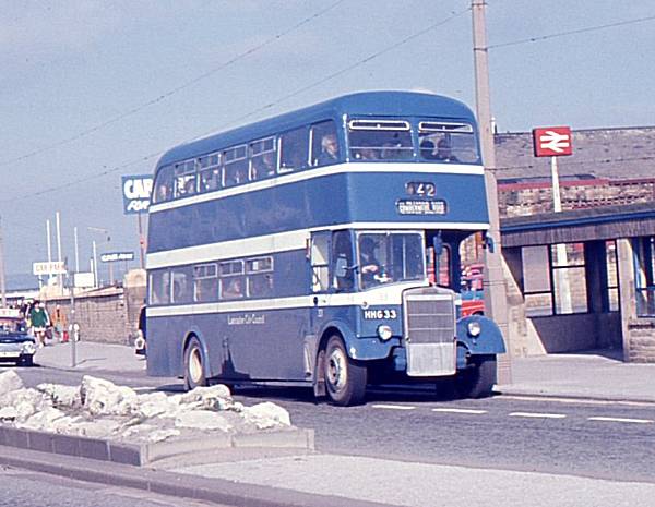 Lancaster City Council 33, HHG33, a Leyland PD3/6 with East Lancs H41/31F bodywork, picks up passengers outside the erstwhile Morecambe Station. It had been new in March 1959 to Burnley, Colne and Nelson as their 233.