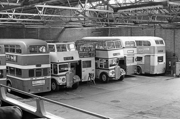 A selection of Morecambe buses parked up in the depot. To the right is the former 20, JTE546, the last of a batch of AEC Regent 6811As with Park Royal H30/26R bodies which was by then not in passenger service and used as a promotional vehicle. Next is the rear of 81, the highest-numbered Regent III in the fleet which was a 1954 6812A model with Park Royal H33/26R body. The next three, in the same order, are 58, 61 and 65 (KTF 587/90/94), all pre-selector 9612E models with Park Royal O33/26R bodies which had long lives due to their open-top status. Finally on the left is 32, HHG32, an East Lancs H41/32F-bodied PD3/6 formerly in the Burnley, Colne and Nelson fleet.