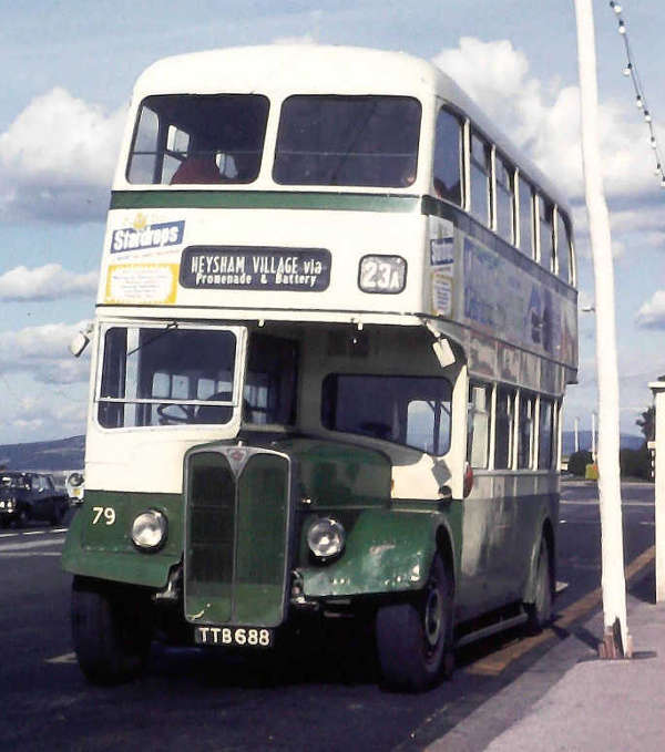 Lancaster 79, TTB688 was new to Morecambe & Heysham Corporation in 1954. She was an AEC Regent III 6812A with a Park Royal body which had a seating arrangement of H30/26R when new.