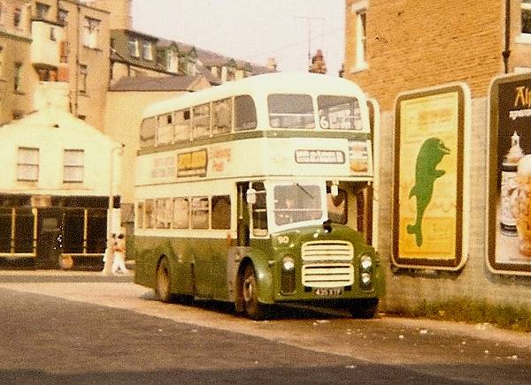 Morecambe's last new double deckers prior to amalgamation with Lancaster in 1974 were a pair of Massey bodied Leyland Titan PD2A/27s new in 1962. 90, 435XTF, is seen at the Battery bus park.
