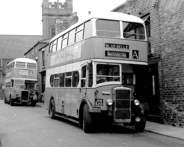Seen in Peel Street, Bishop Auckland was Anderson (Blue Belle), Evenwood JVK620, a Daimler CWA6 with a Massey H30/26R body which had been new in January 1946 as Newcastle 20.