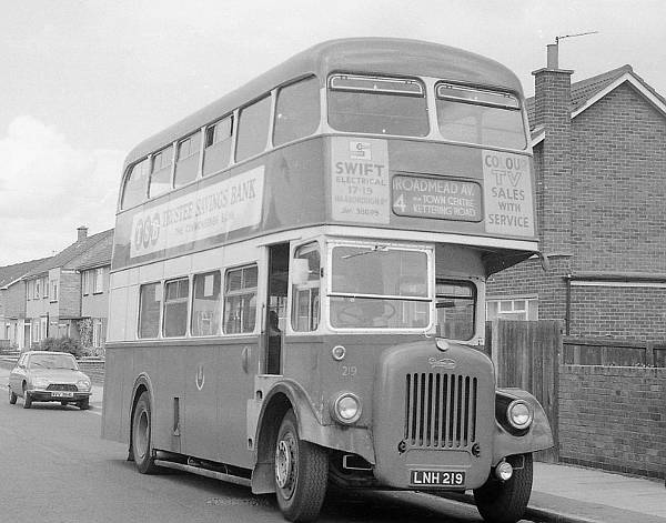 Northampton 219, LNH219, a 1960-ish Daimler CVG6/Roe. This bus is in the later livery, with more off-white, but retains the earlier style of destination display