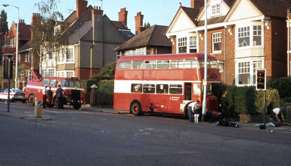 Having worked an out-bound evening peak service, 247 was being driven back to town in the usual N.T. way; the driver was on his last trip of the day and speed was of the essence. Such journeys often ignored waiting passengers and regarded red traffic lights as merely a suggestion but, on this occasion, the driver of a Cortina decided that a traffic light that had just turned red indicated 'stop' to the evident surprise of the bus driver following close behind.