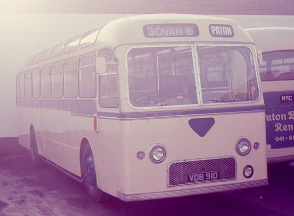 Paton Bros VDB910, a Leyland PSU3/3RT with Alexander DP49F bodywork which was new to North Western in March 1962 as their 910, stands in dazzling sunshine in the yard at Renfrew Ferry. Patons acquired it in November 1975 and withdrew it in October 1977.