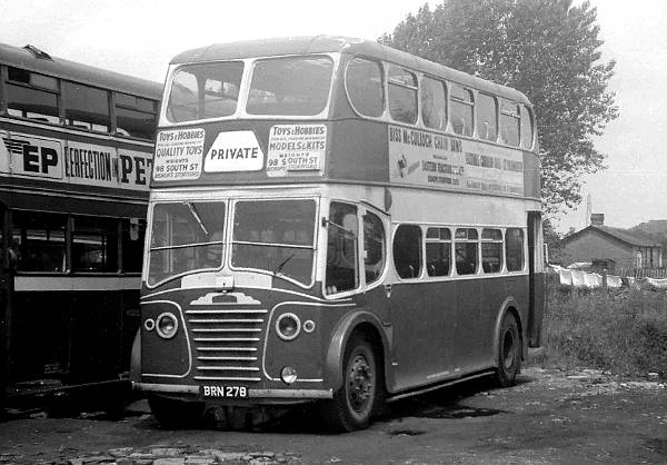 Pond of Nazeing BRN278, a 1948 Leyland PD1/3 with Burlingham FCL27/22RD coachwork, one of the famous Ribble "White Ladies" seen at the company's yard during an enthusiasts tour in June 1965. The livery was red and cream.