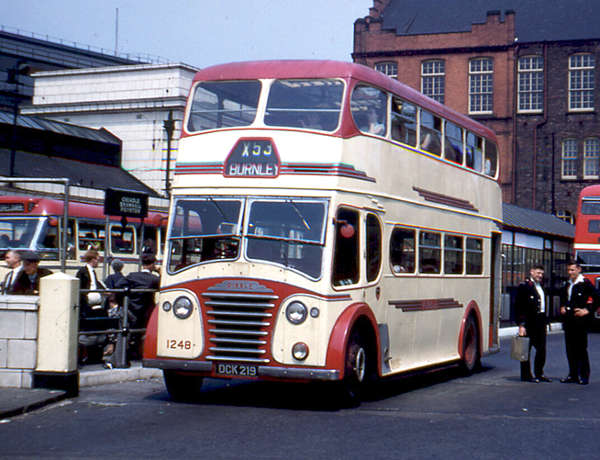 Ribble, Preston 1248, DCK219, a Leyland PD2/3 with an East Lancs FCL27/22RD body, is seen in Lower Mosley Street Bus Station awaiting departure to Burnley on the X53 service.