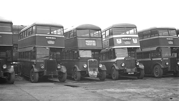 Vacuum Oil buses from left to right are three ex-Salford Leyland TD5s and an ex-Leeds AEC Regent. ABA623 was a 1938 TD5 with Leyland body, CNW909 with Roe body new in 1936, ARJ486 a 1939 TD5 with Metro-Cammell body and finally ABA622, another 1938 TD5 with Leyland body.